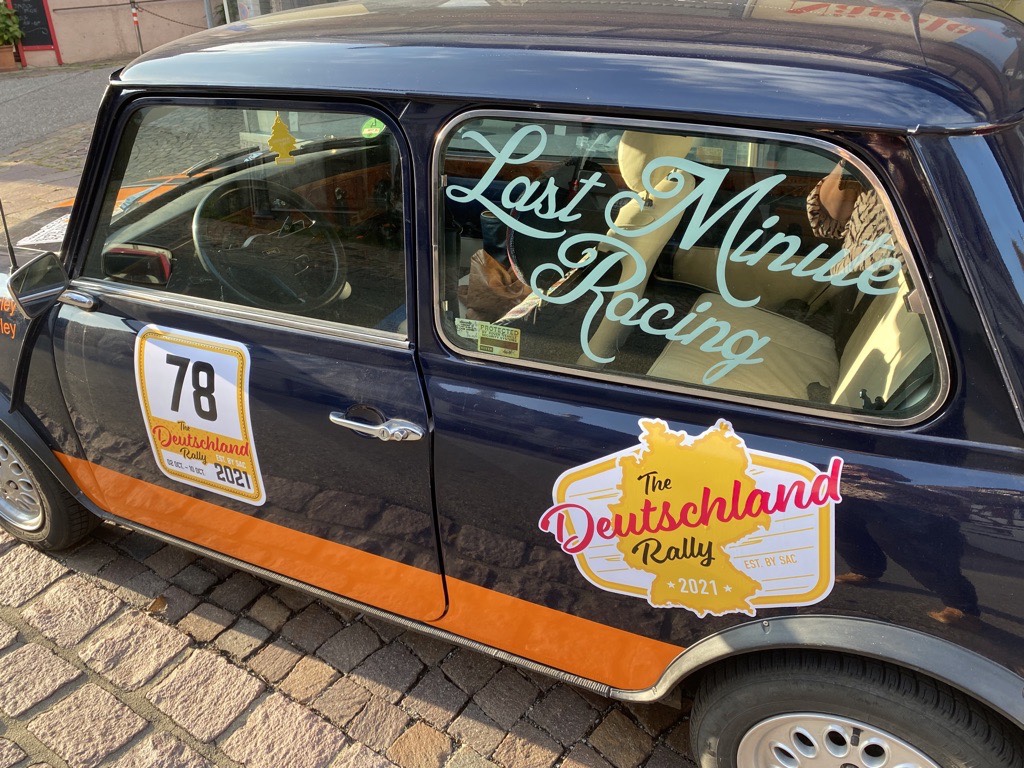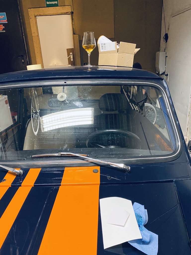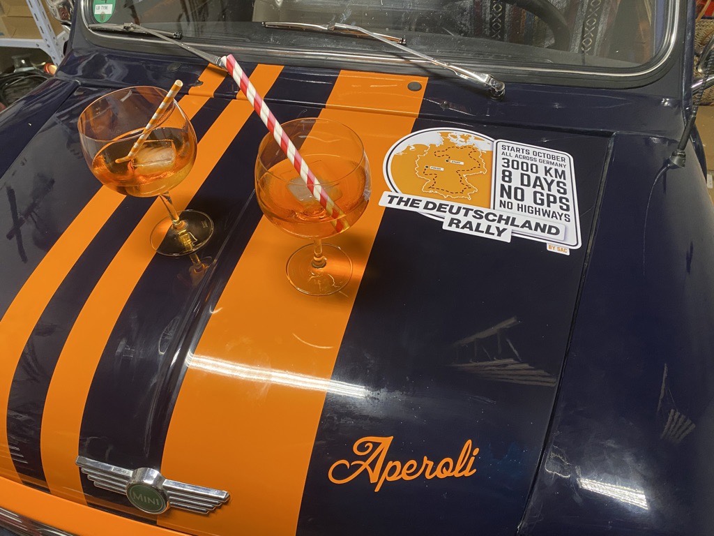 Time to get to work targeting a couple of extra points by the rally jury for an eye catching vehicle decoration. Our motto: Aperol for the team, Rally stripes for the car (the more the faster). Of course, all aligned with the rally rules „anything goes as long as it’s street legal“ 😉