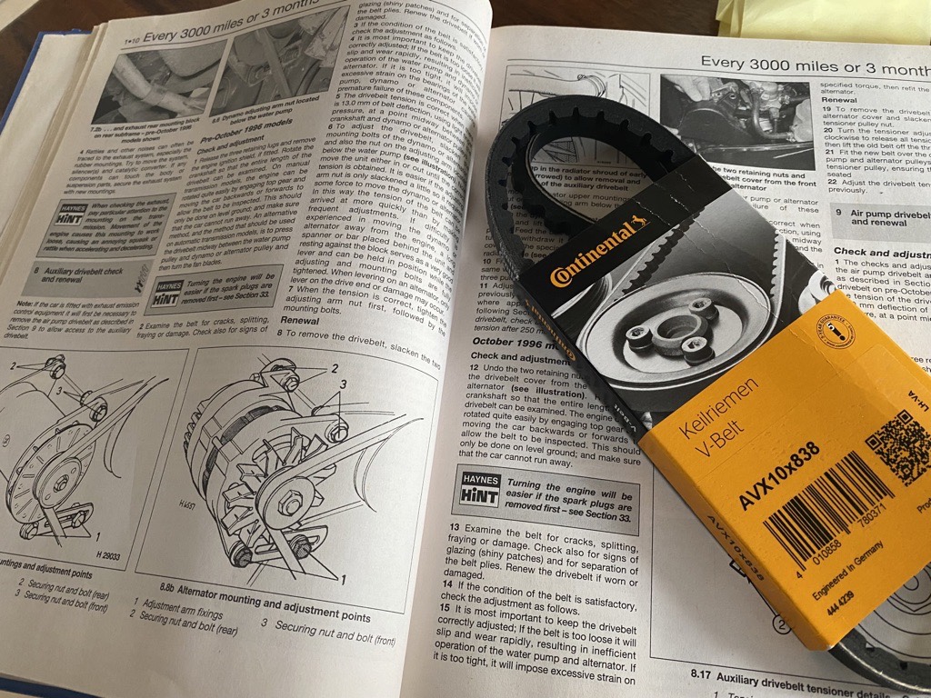 After 3 trial purchases of the fan belt, hubby has now figured out why they don’t fit: the car has a different alternator (made by Bosch. At least.). Purchase no. 3 “was fitted” eventually (with force). The other two „wrong“ purchases will be held for emergency backup (I hope we’ll never need them since they don’t fit…).