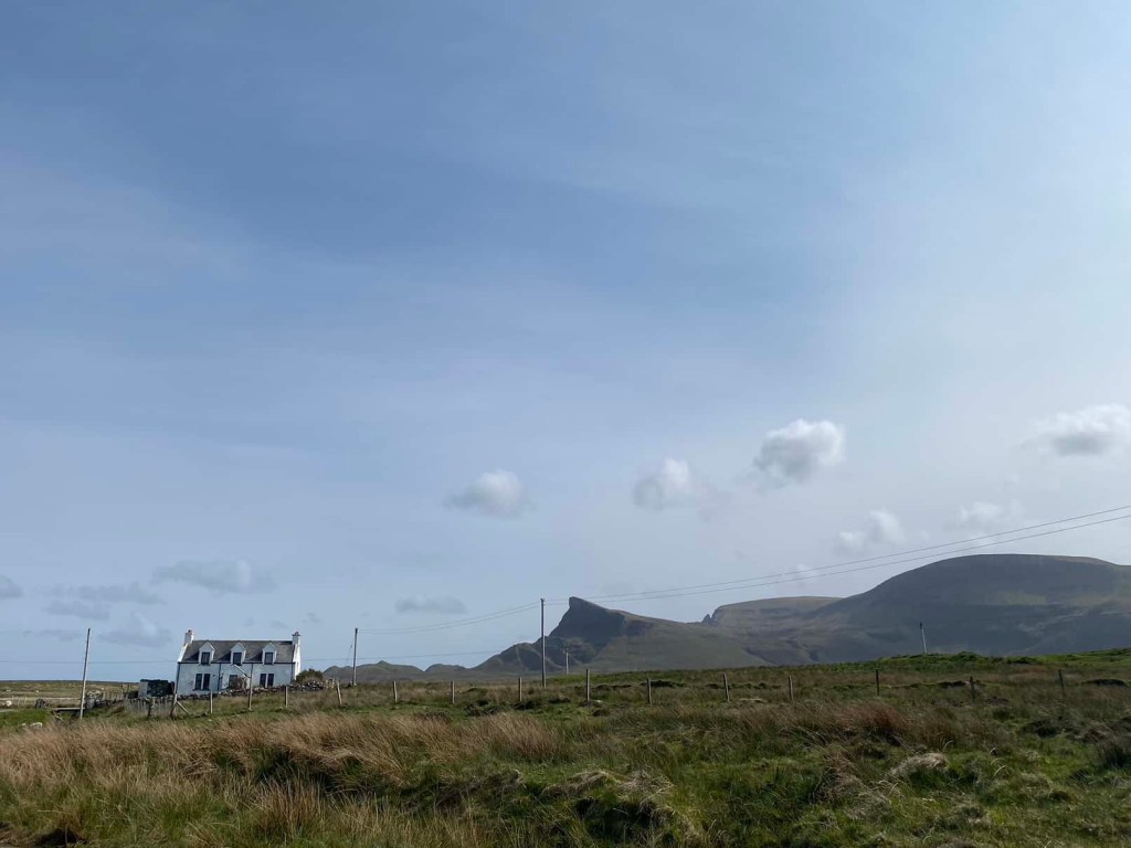 Wild and far away: from people and everyday life. That can be very beautiful or turn into a problem if you break down…. Very bumpy roads on Skye… We went over a cattle grid and saw the steam start. We’d stopped to let someone pass then just started again when it happened: the radiator exploded, all water out within seconds. Calling for help but made the last 2 miles down the hill with engine off back to hotel parking.