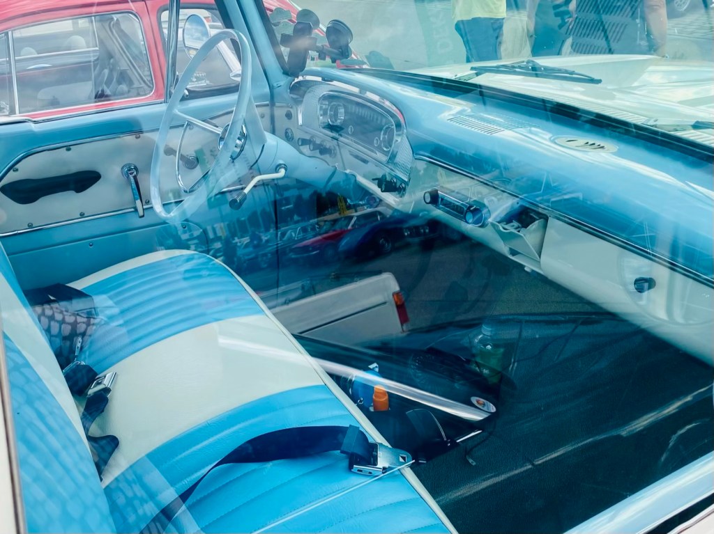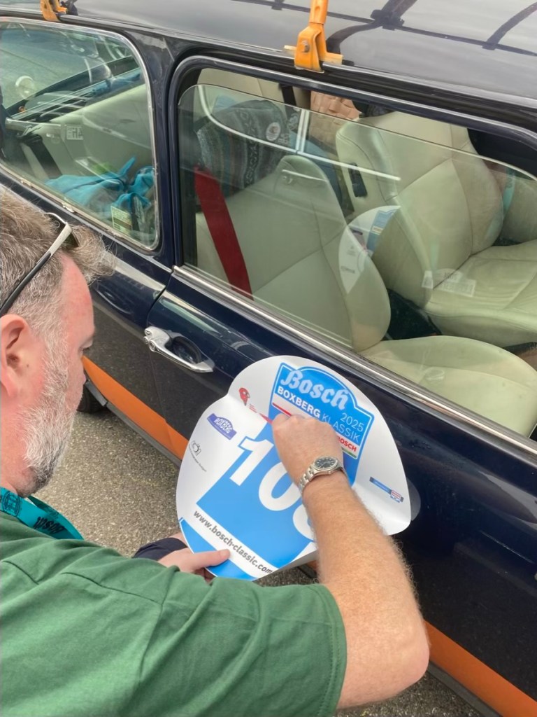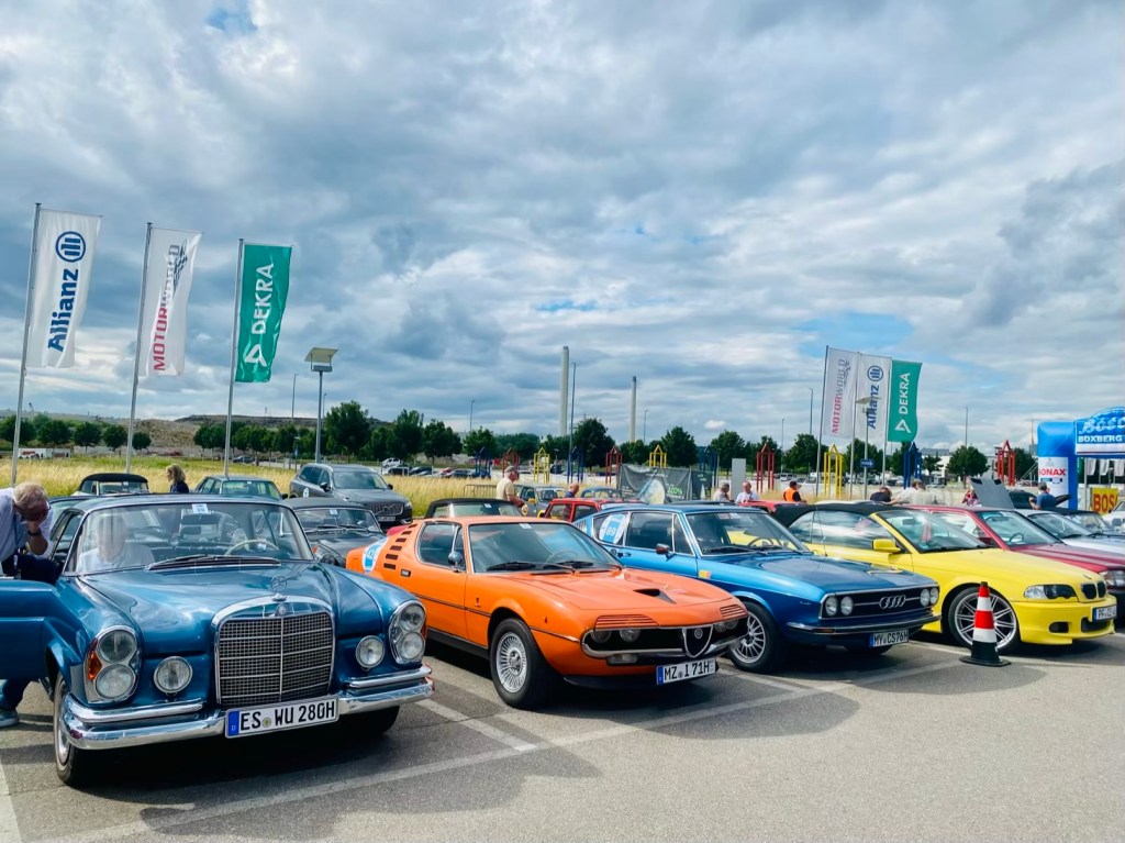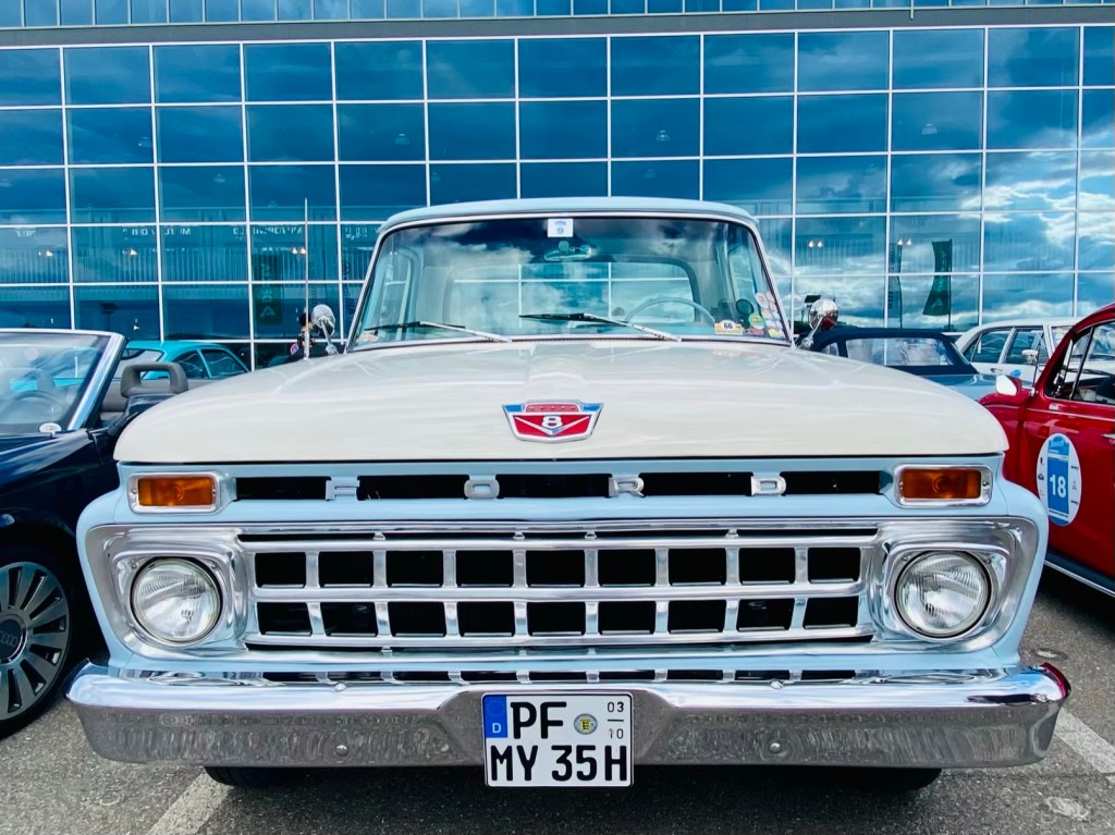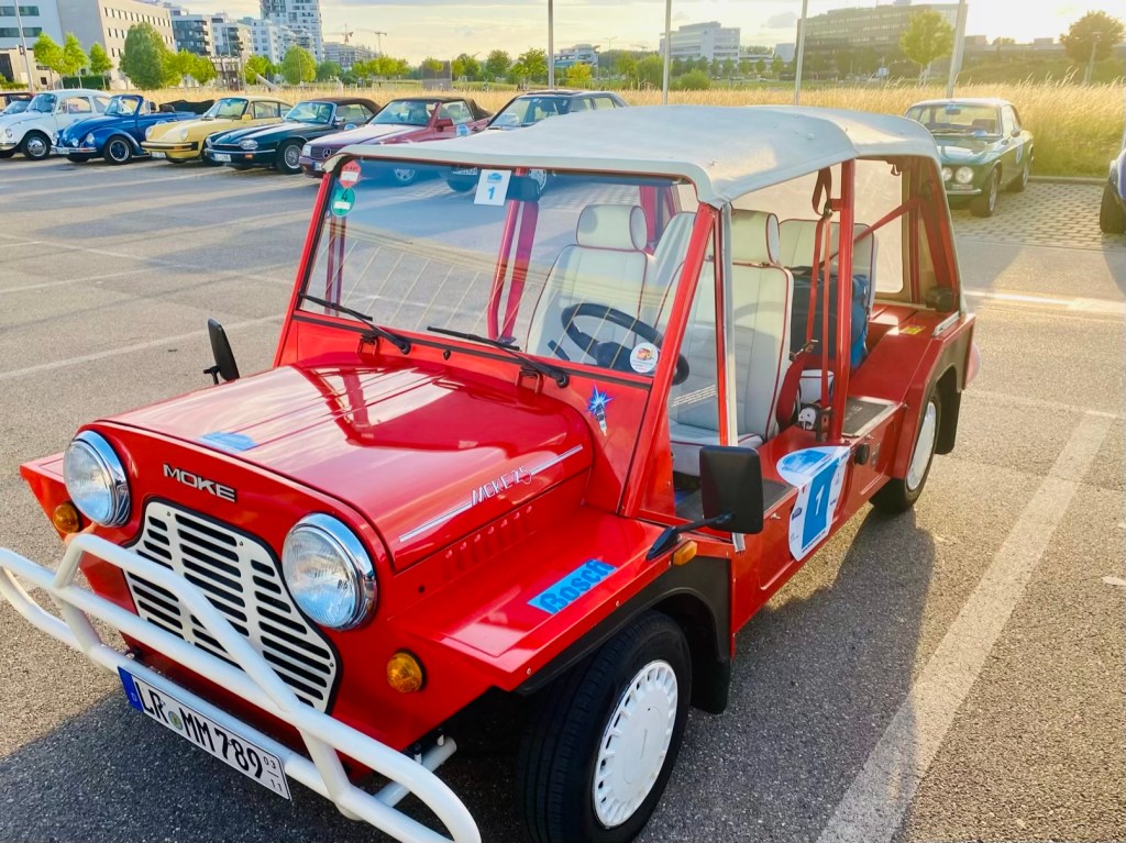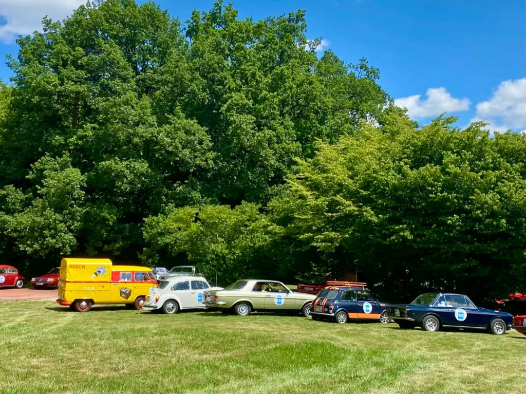 8am: driver briefing in the morning – no appearance = 100 penalty points 🫣Start number #1 – we found a relative 🫶 a mini moke8:30am: The start of the 24th Bosch Boxberg Klassik Rally on day1 at the MotorworldFord F150 pick-up: the most favorite car in the world!!! 40mio times produced! This one was exported in Florida. Love the baby blue seats 🩵 More American beauties: Ford Mustang ❤️