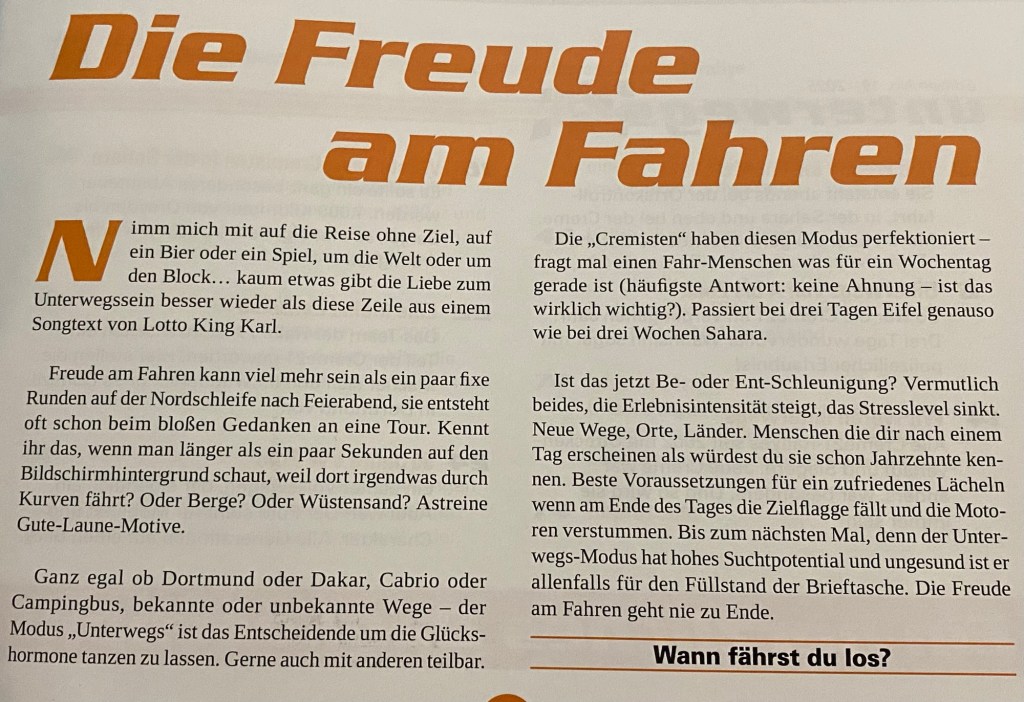Dress code: anything as long as it is orange! That counts for the Oldtimer as well as the driver and co-pilot. It gets really interesting when a couple of Oldtimers are stopped at traffic lights, one of the drivers is dressed in a bathrobe and getting out of the car, opens the trunk to get a bottle of beer βπ» Wondering what the local drivers thought of us π